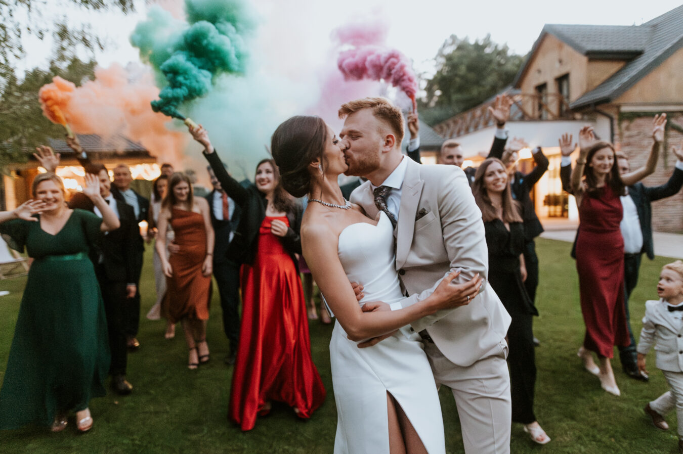 W trakcie imprezy zrobiliśmy też kilka zdjęć z zimnymi ogniami — wiadomo, klasyka romantycznego reportażu ślubnego, która zawsze działa. Ale prawdziwy sztos wydarzył się podczas zdjęć grupowych — para zdecydowała się na kolorowe dymy, które dodały całej sesji energii i pazura. Efekt? Spektakularny.