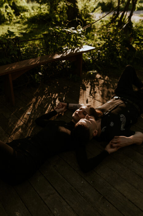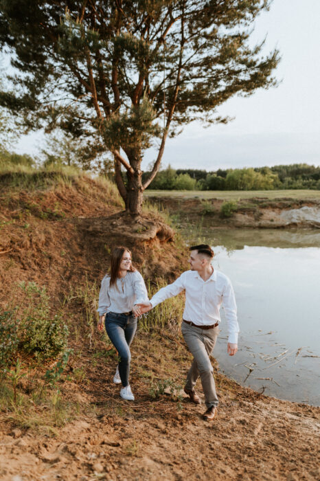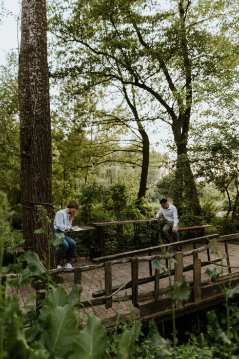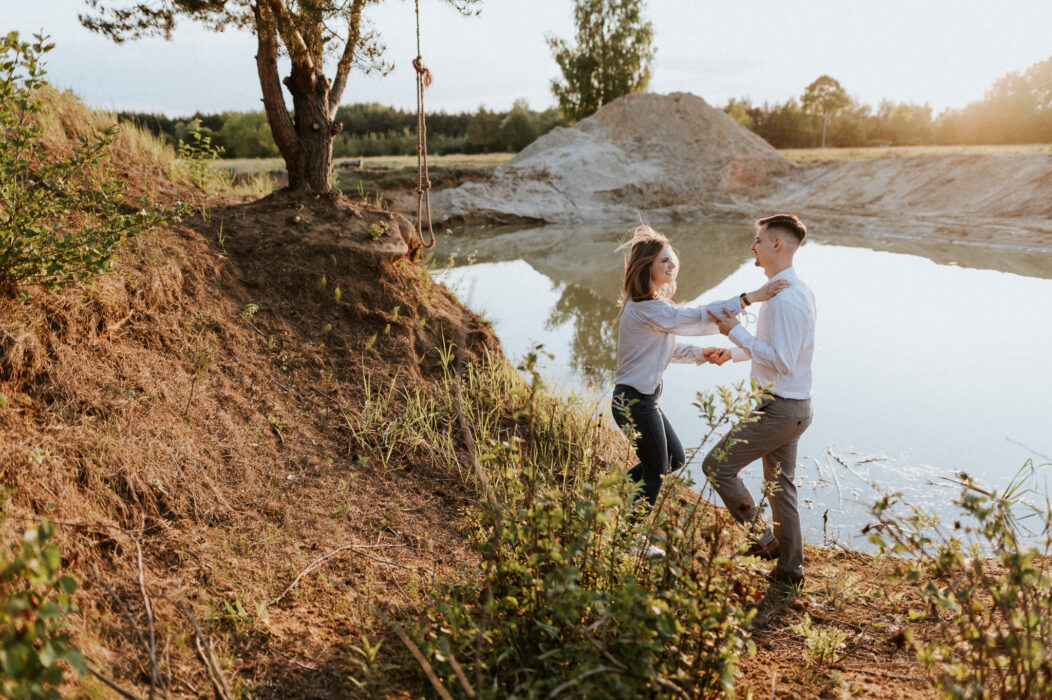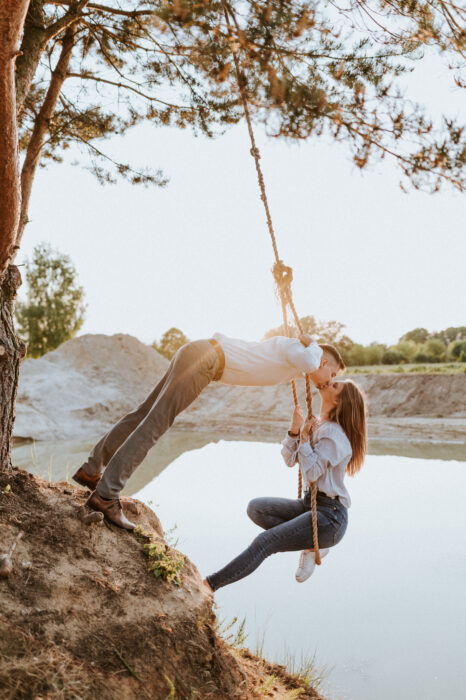 Na koniec poszliśmy nad jezioro, które… znowu zaskoczyło. Bo nie było tylko pięknym tłem. Tam narzeczeni latali na linie nad taflą wody — i nie, to nie metafora (ja bym się w życiu na to nie odważyła!). To był czysty fun i dzikość, którą kocham łapać w kadrach.