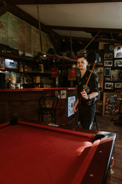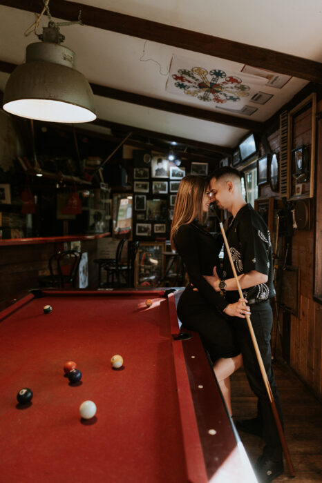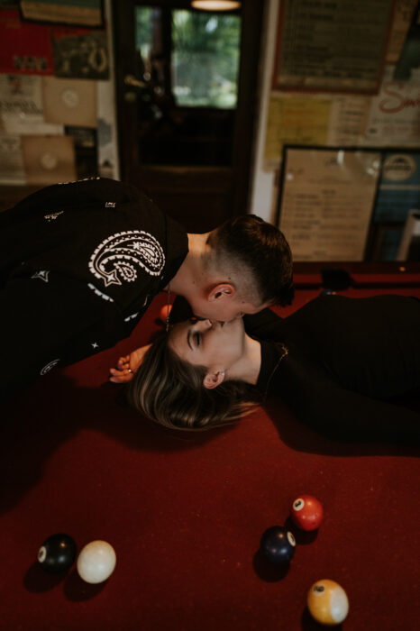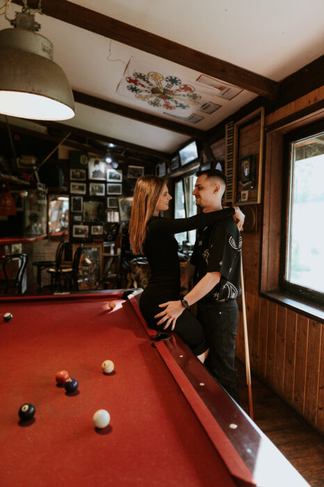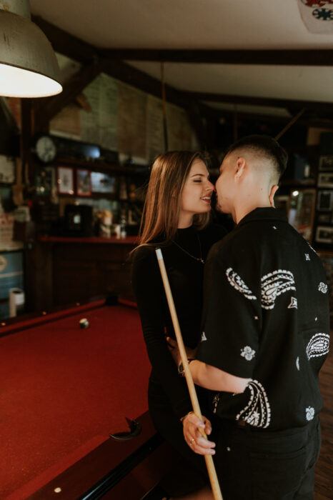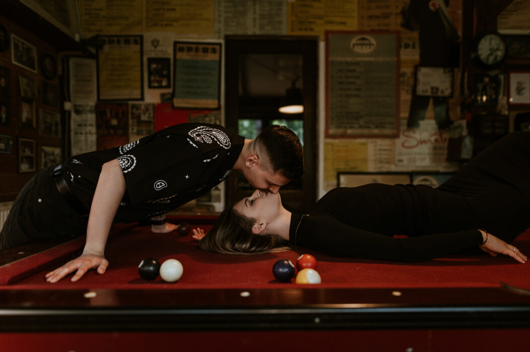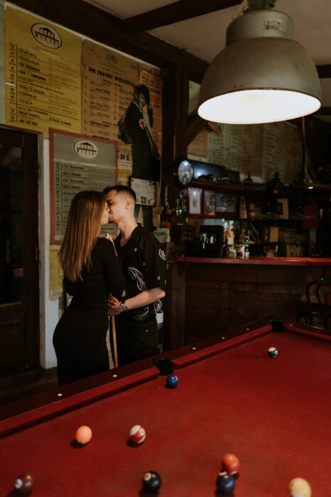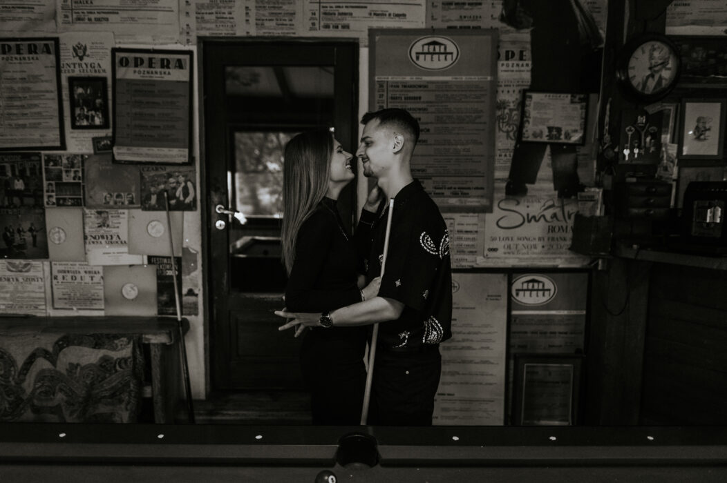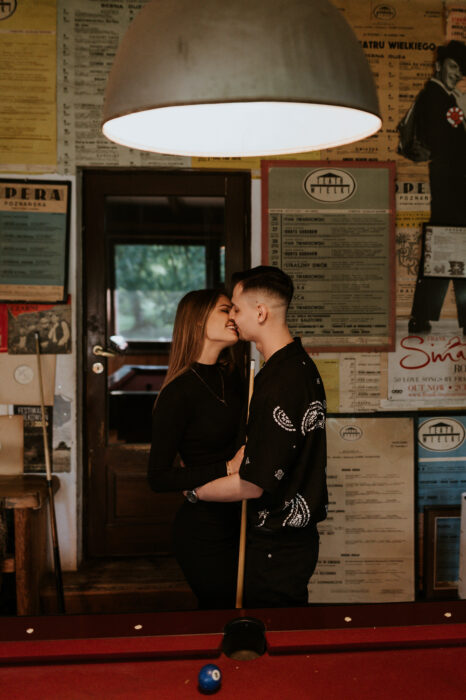Na start… sala bilardowa! Tak, dobrze czytasz – romantyczna sesja i bilard mogą iść w parze. Szczególnie gdy on jest jego wielkim fanem. To był jego świat, jego klimat – i dzięki temu mieliśmy prawdziwe emocje, śmiech i autentyczne gesty. Uwielbiam takie personalne akcenty!