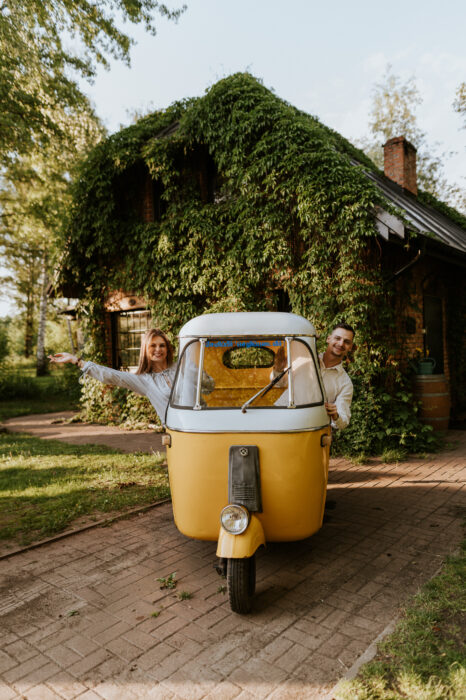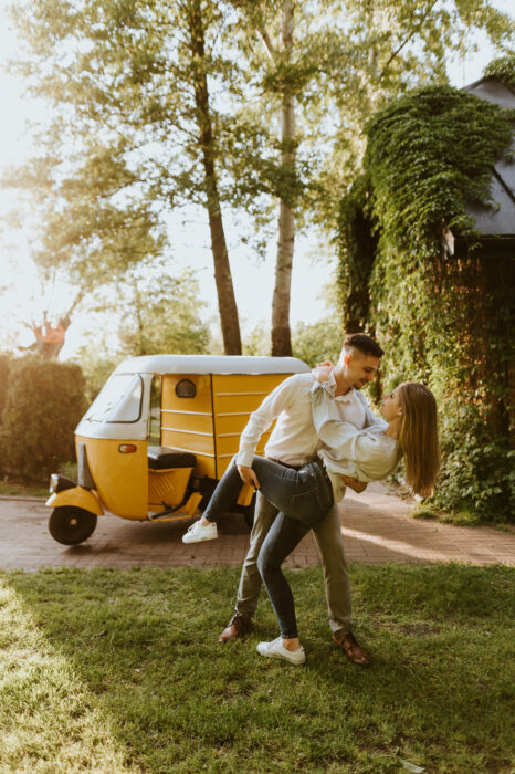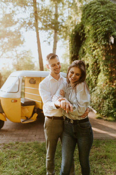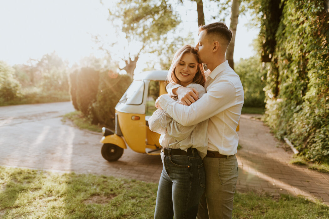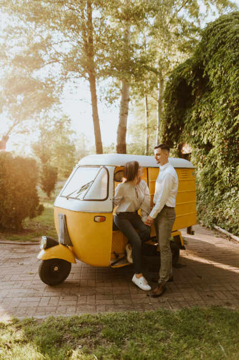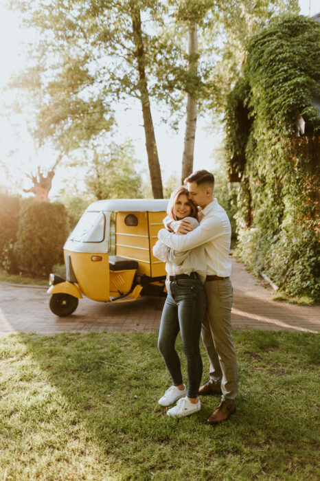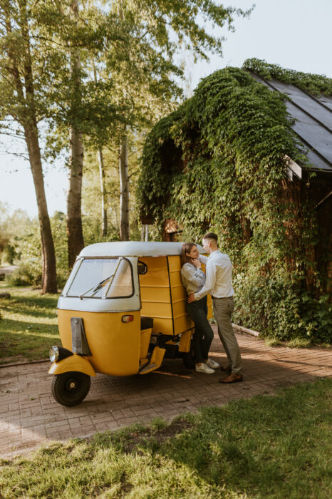 Potem złapaliśmy się na zachód słońca przy żółtym tuk tuku (serio, czy to nie brzmi jak marzenie fotografa?). Światło grało idealnie, narzeczeni byli już totalnie wyluzowani, a zdjęcia z tego momentu mają w sobie coś z filmu drogi.