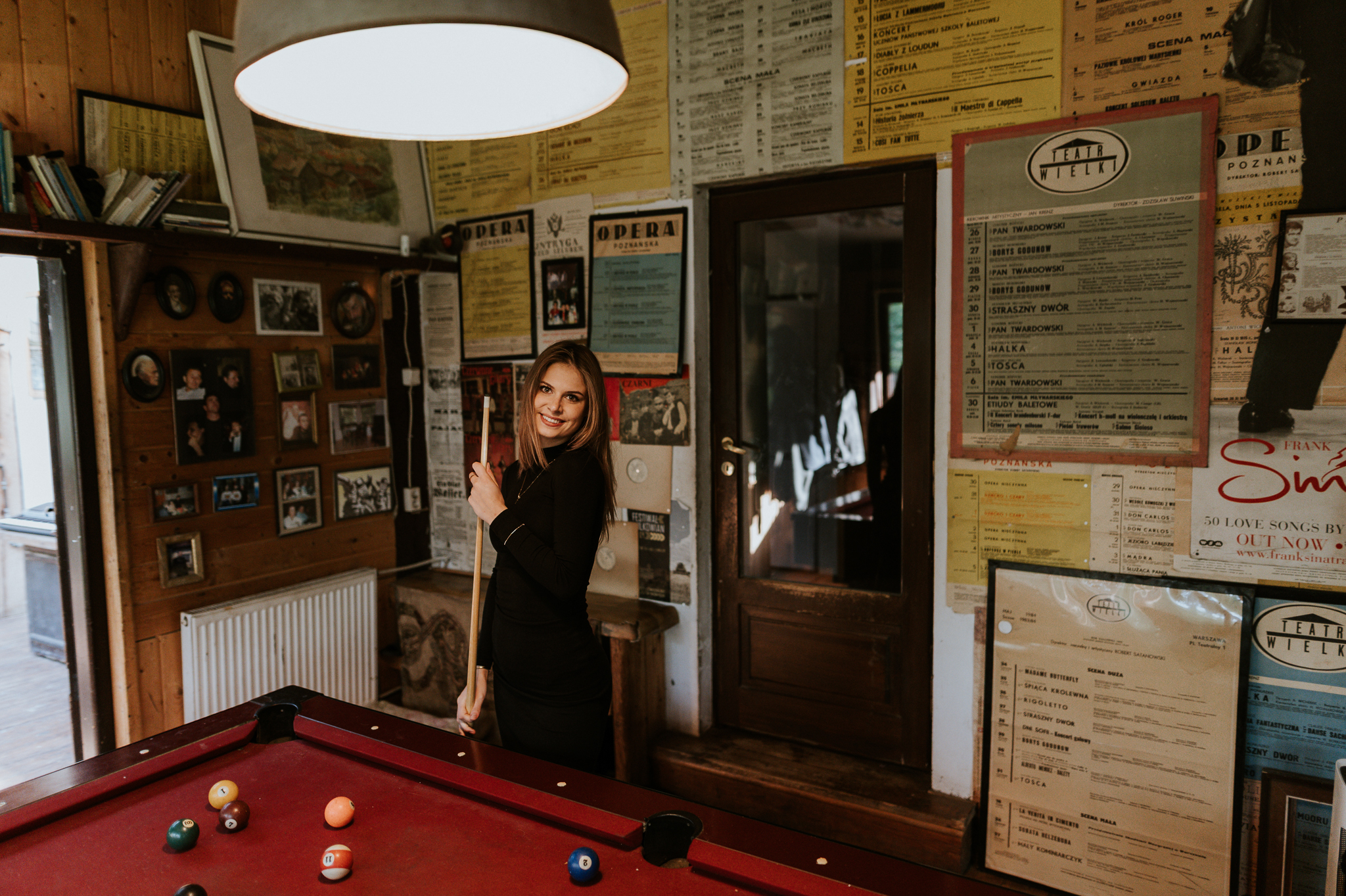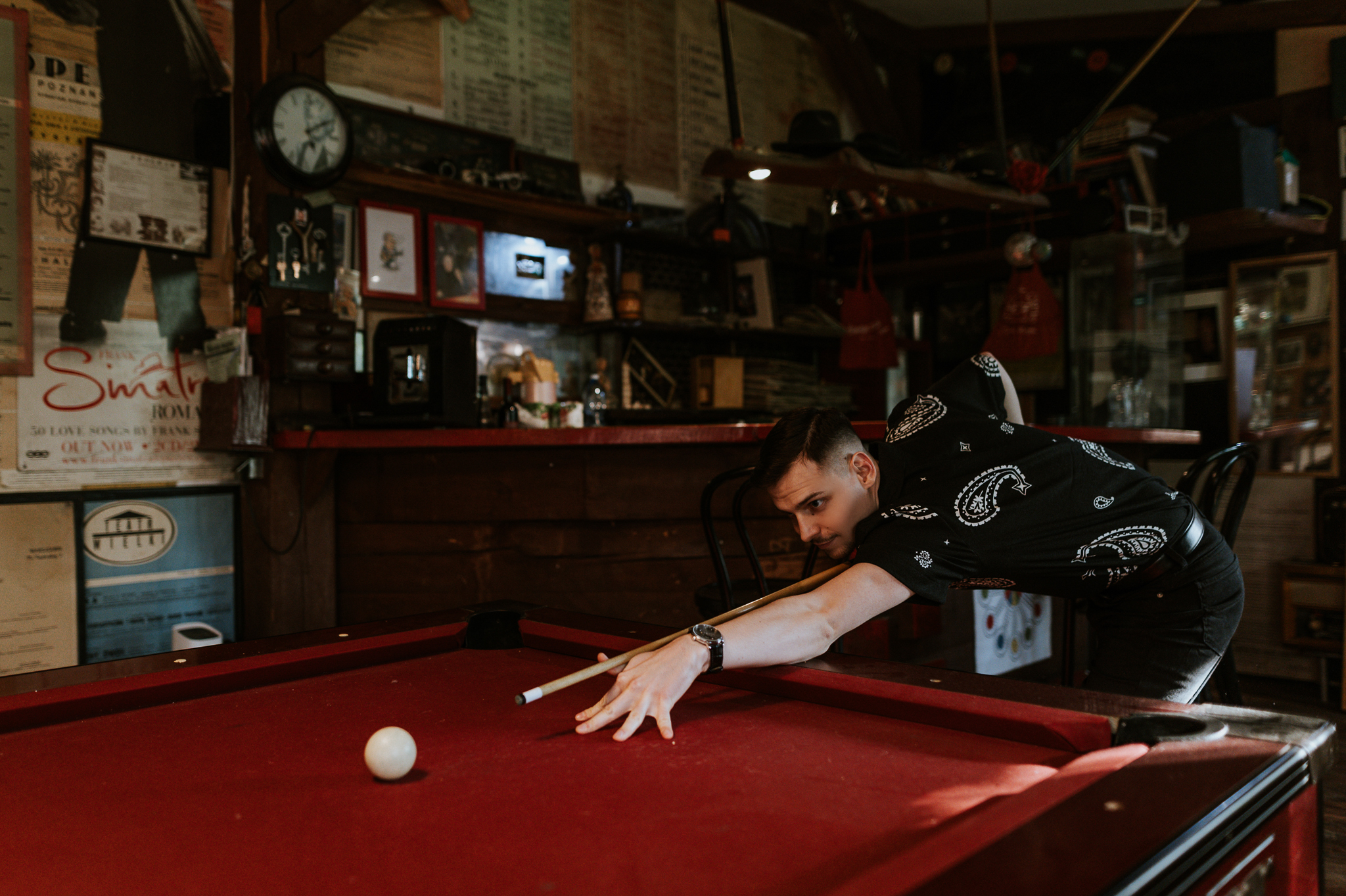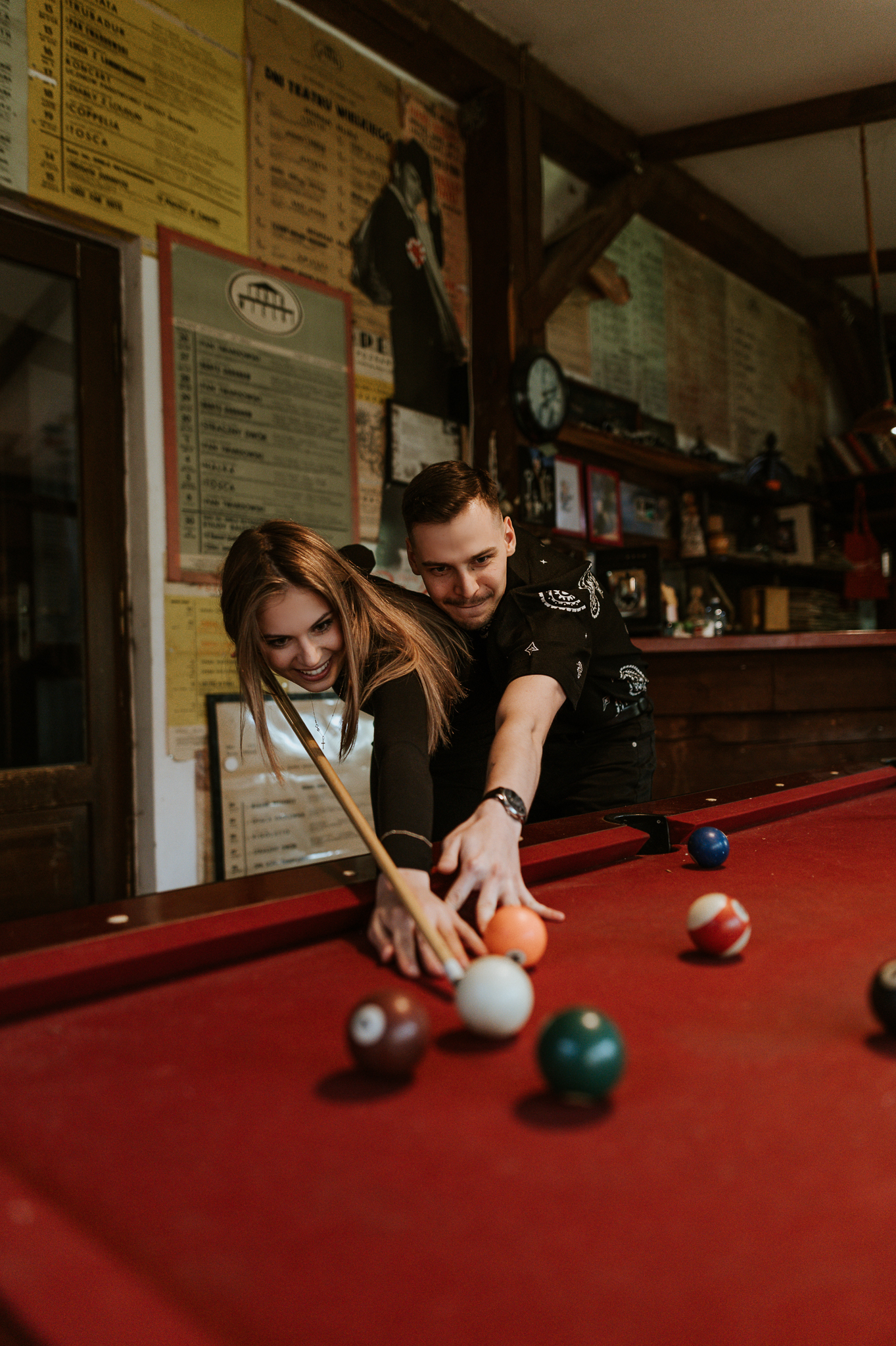 Na start… sala bilardowa! Tak, dobrze czytasz – romantyczna sesja i bilard mogą iść w parze. Szczególnie gdy on jest jego wielkim fanem. To był jego świat, jego klimat – i dzięki temu mieliśmy prawdziwe emocje, śmiech i autentyczne gesty. Uwielbiam takie personalne akcenty!