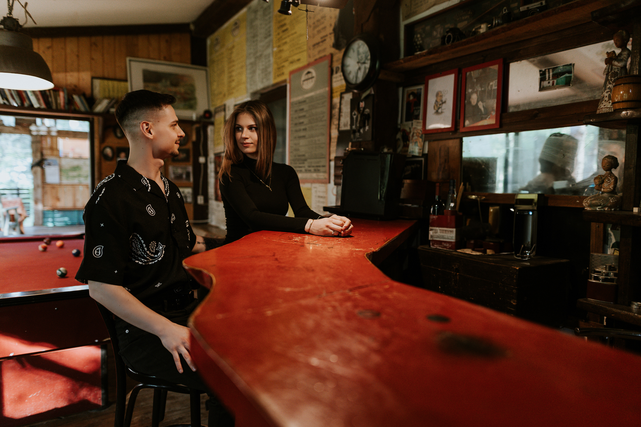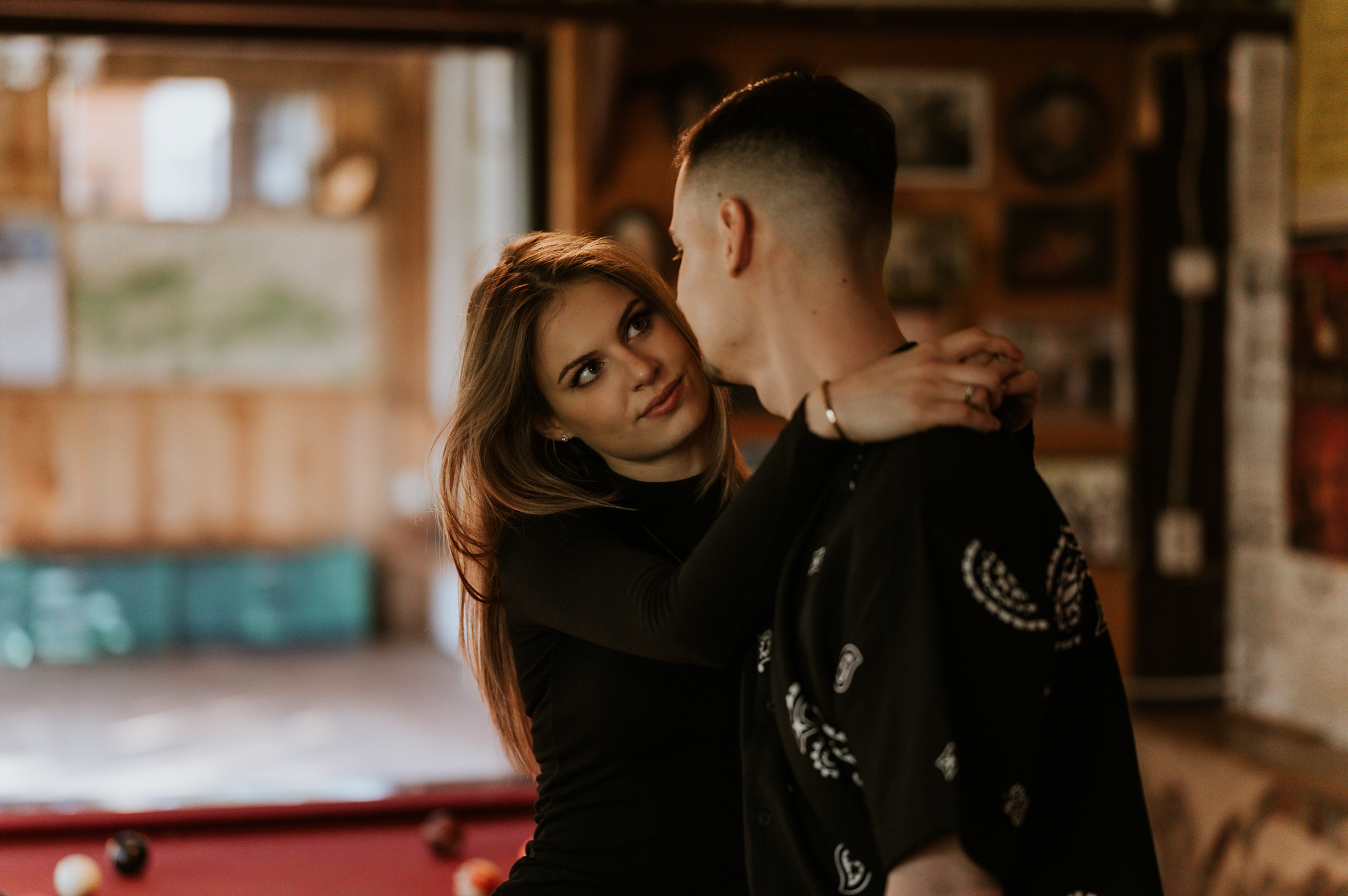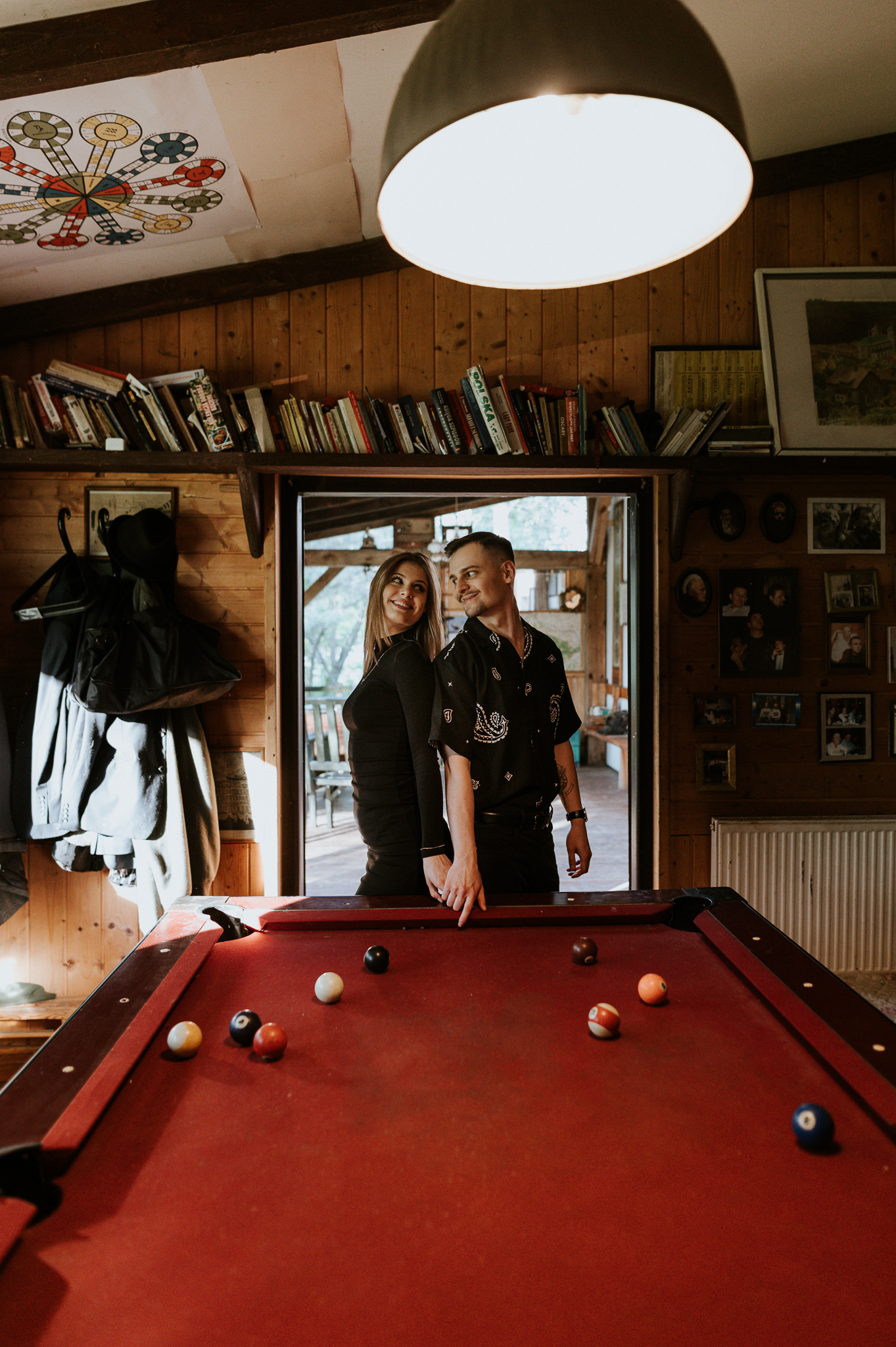 Na start… sala bilardowa! Tak, dobrze czytasz – romantyczna sesja i bilard mogą iść w parze. Szczególnie gdy on jest jego wielkim fanem. To był jego świat, jego klimat – i dzięki temu mieliśmy prawdziwe emocje, śmiech i autentyczne gesty. Uwielbiam takie personalne akcenty!