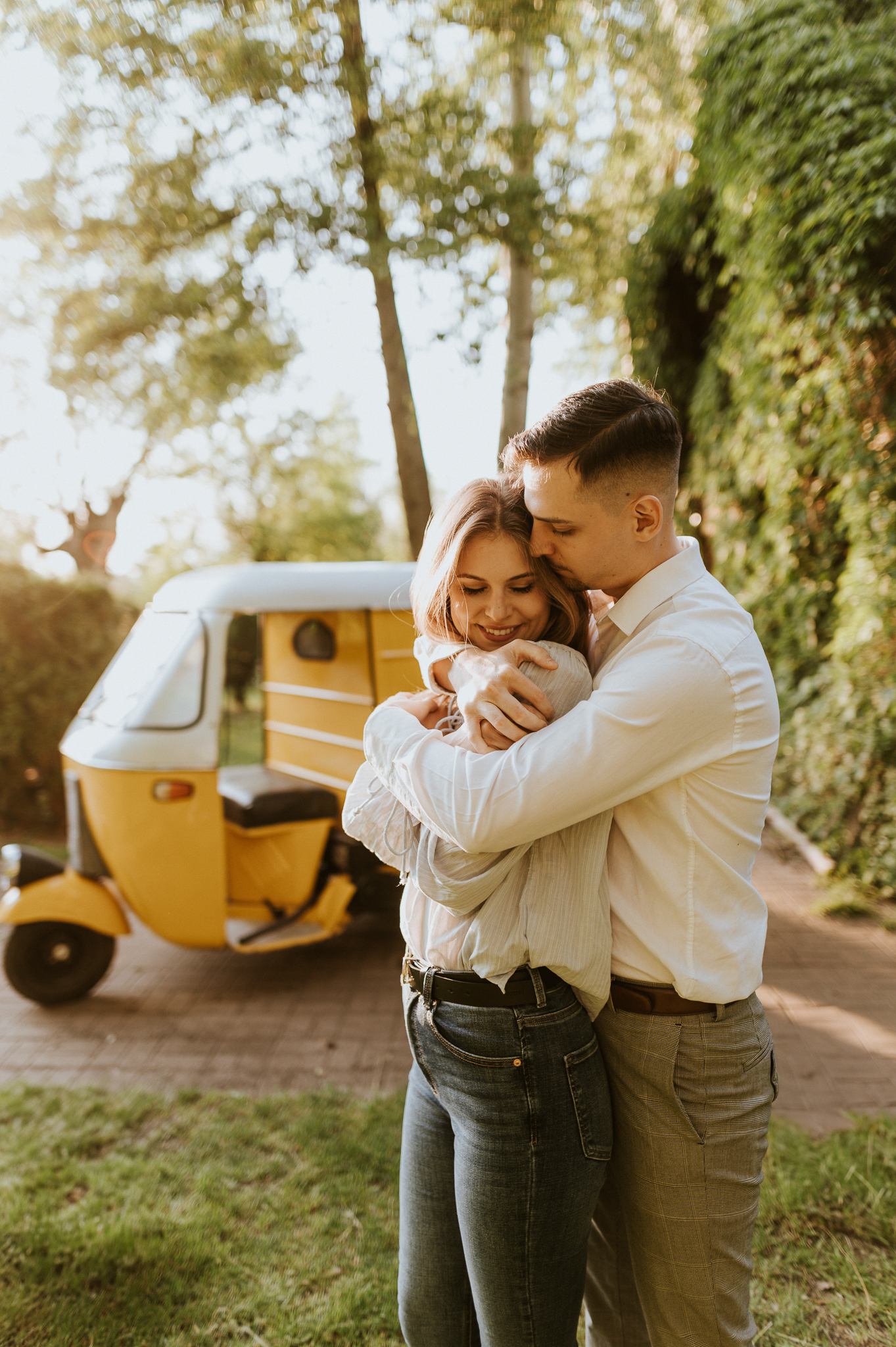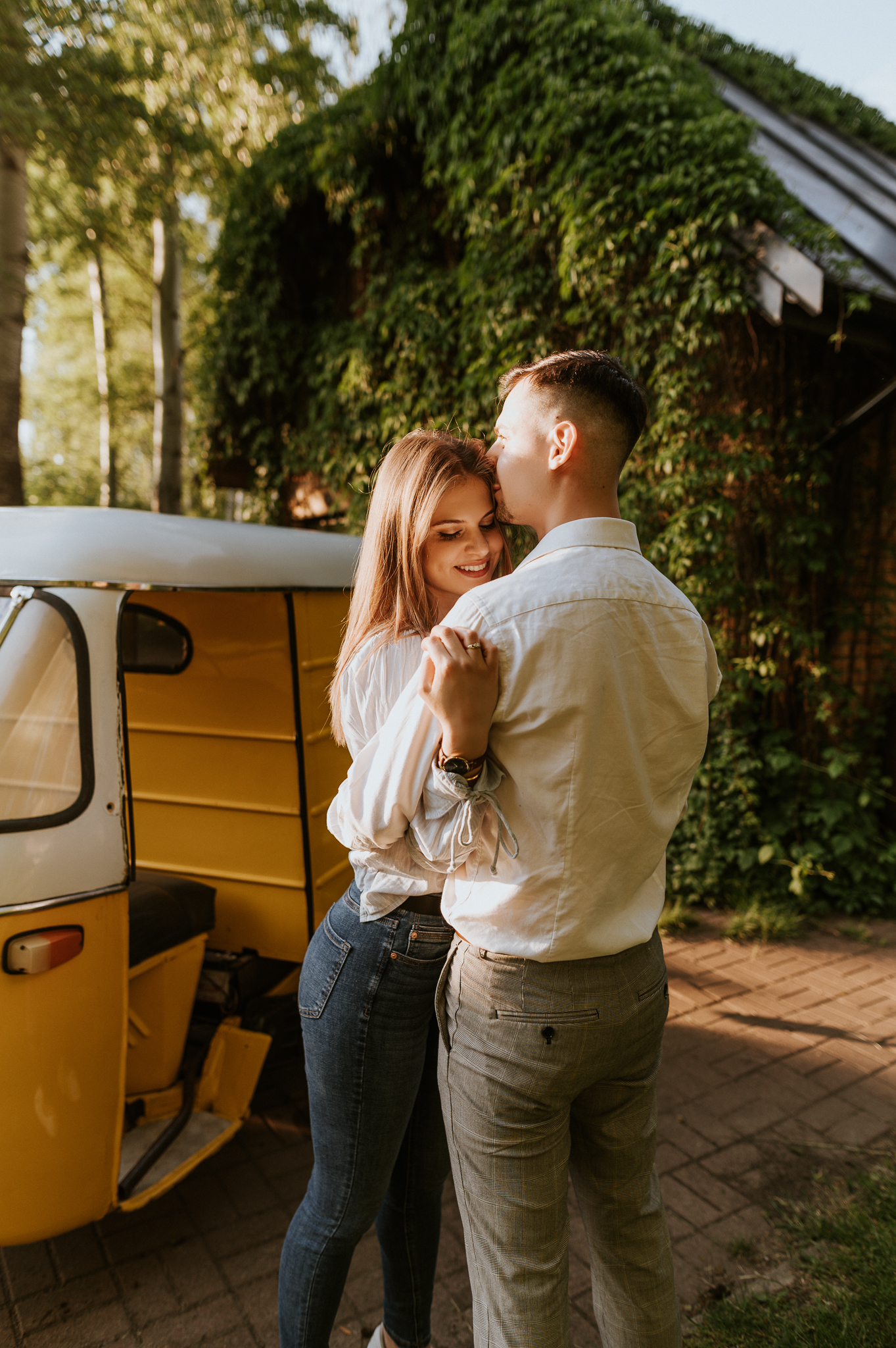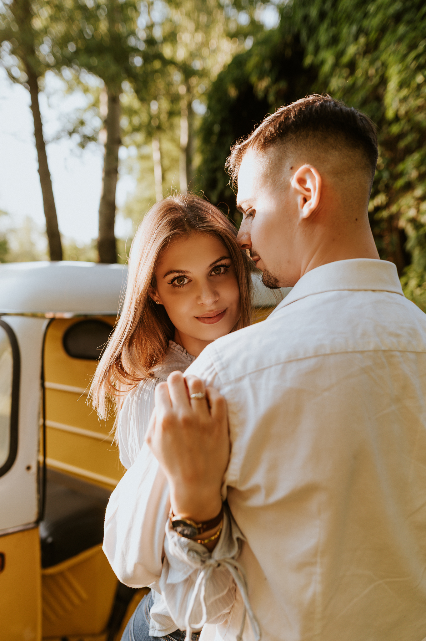 Potem złapaliśmy się na zachód słońca przy żółtym tuk tuku (serio, czy to nie brzmi jak marzenie fotografa?). Światło grało idealnie, narzeczeni byli już totalnie wyluzowani, a zdjęcia z tego momentu mają w sobie coś z filmu drogi.
