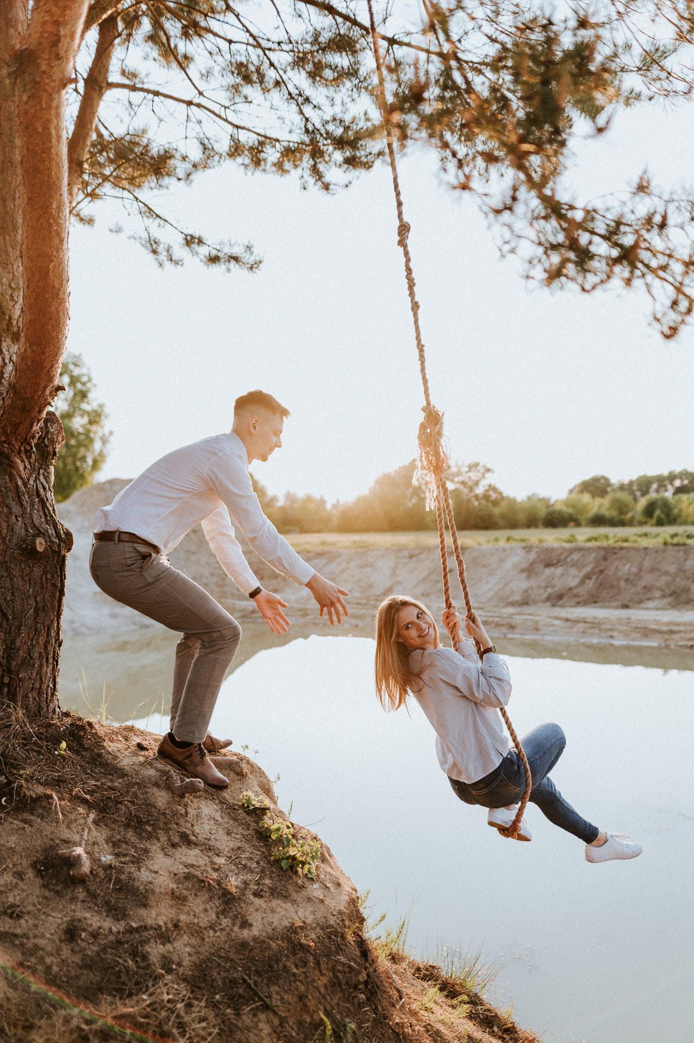 Na koniec poszliśmy nad jezioro, które… znowu zaskoczyło. Bo nie było tylko pięknym tłem. Tam narzeczeni latali na linie nad taflą wody — i nie, to nie metafora (ja bym się w życiu na to nie odważyła!). To był czysty fun i dzikość, którą kocham łapać w kadrach.